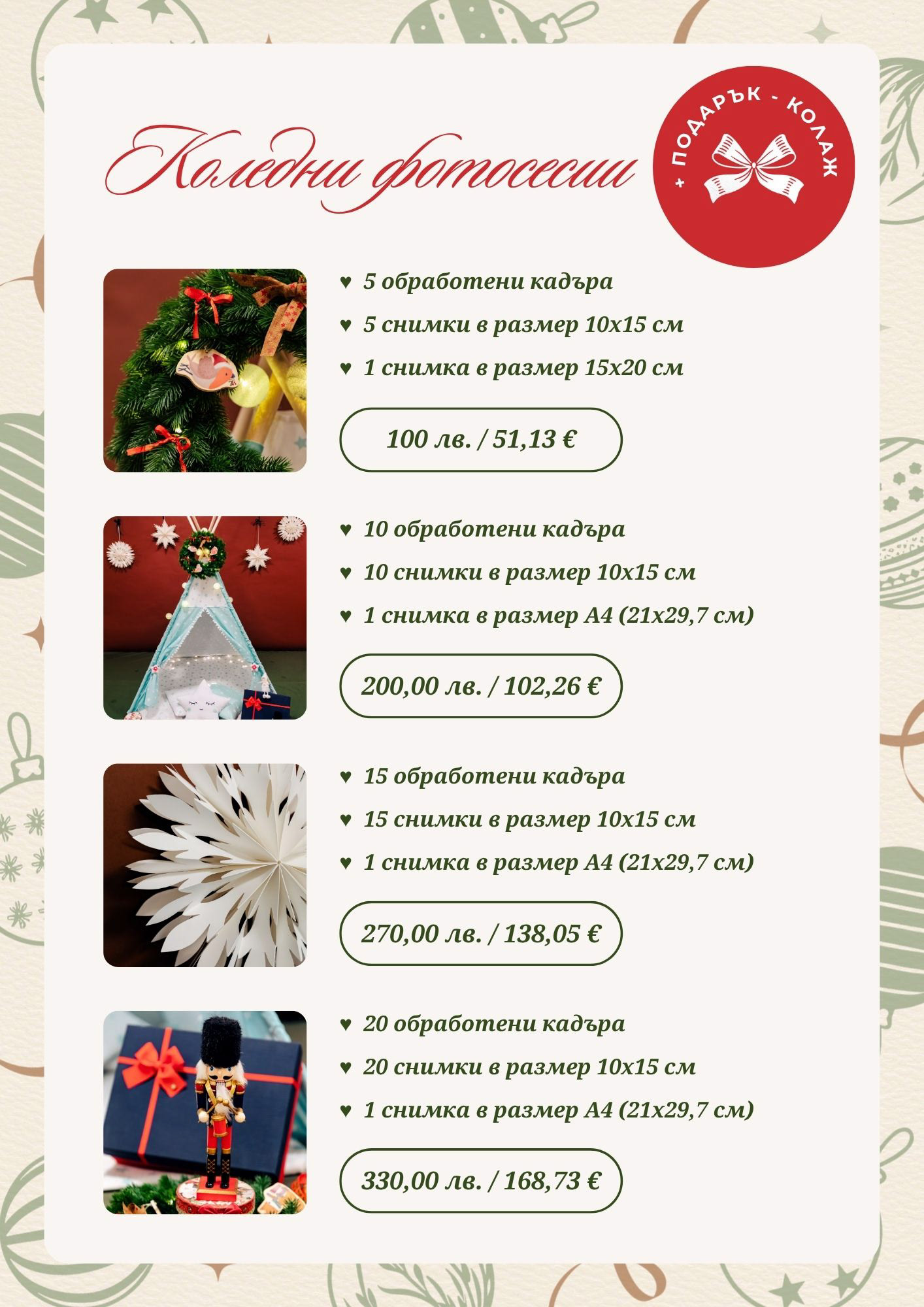 Съхранете радостта от споделеното време заедно в уютна коледна фотосесия.